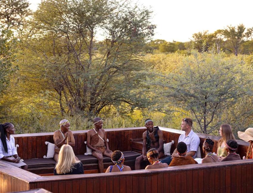 Det er imidlertid det ekte og autentiske samspillet med naboene, San-folket, som gjør Feline Fields Lodge helt unik. Her får du som gjest «henge med» buskmenn. Lære og oppleve. Historiefortelling som trollbinder. Førstehånds. Hvordan de levde og overlevde. Hverdagen, i dag. Ved bålet. Ute i bushen. I landsbyer. Du og buskmennene fra San-folket. Mennesker som stammer fra en av verdens eldste kulturer. Og har du lyst, kan du overvære San-folkets mystiske og spirituelle transedanser.