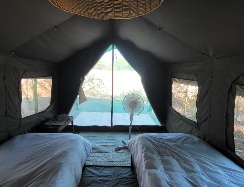 Nkonzi-campen er liten, med bare fire safaritelt. Alle med eget bad under åpen himmel, med vannklosett, varm dusj og keramisk servant. Enkeltsenger eller king-size-senger med varme dyner og varmeflasker om vinteren og kjølevifter om sommeren.