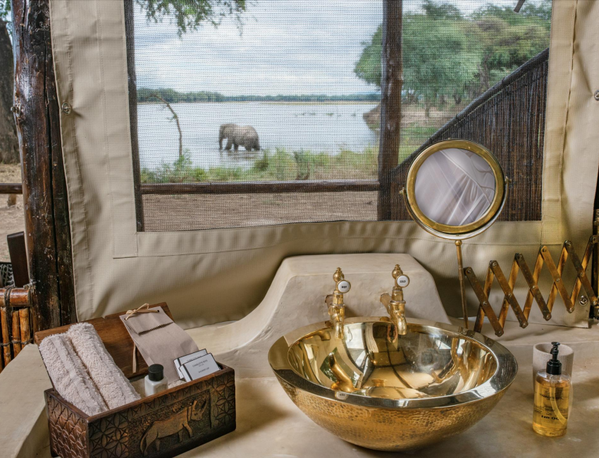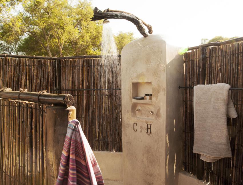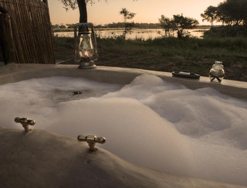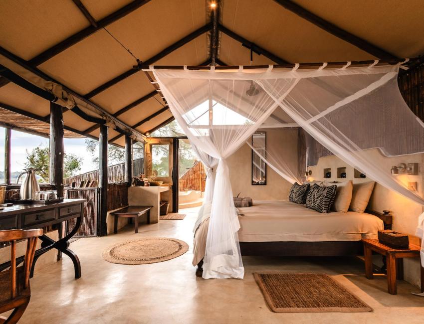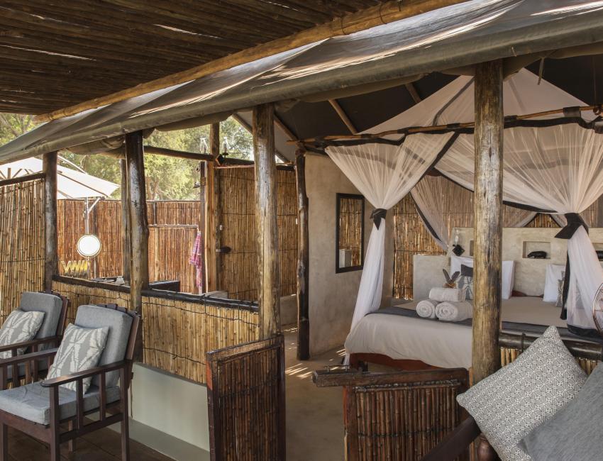 Hyttene er laget av siv og strå med lerretstak. De er rustikke med høy sjarmfaktor. Sengene (dobbelt eller enkel) har myggnett og hver hytte har sin egen terrasse hvor du kan se bush-TV (dyrelivet som spankulerer forbi) i ro og mak. Badet har vask, vannklosett og utendørs dusj og badekar.